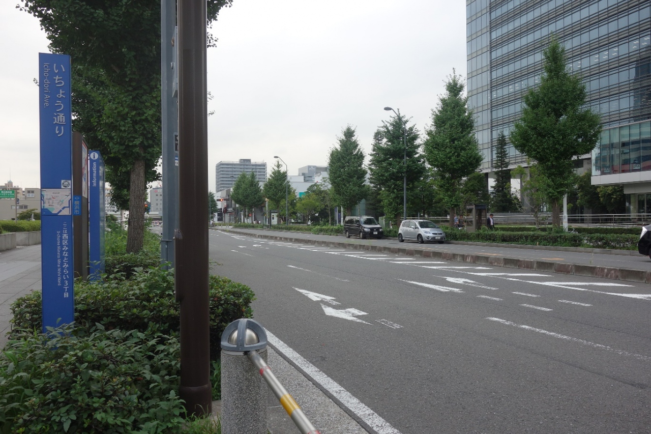 秋には紅葉が美しいこの通りですが、今は夏で広い車道の両側に植えられたいちょうの並木が緑色で美しかったです。みなとみらい地区の横浜美術館の端を通っている通りで歩道も広くよく整備されています。みなとみらいを散策する際に使える通りのひとつです。