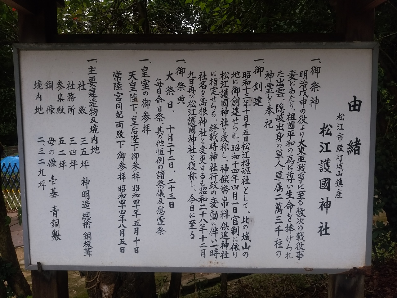 松江城に隣接した松江公園内にあり、近くには城山稲荷神社があります。明治維新後の国難に殉じた旧出雲国、隠岐国出身の英霊2万2千余柱を祀ってます。第二次大戦後は島根神社と称していたそうですが、主権回復後は元の社名に複したらしいです。鳥居がある階段から黒色の旗に朱色で「大勝利祈願」と書かれた旗が本殿まで続いていて、荘厳な雰囲気でした。