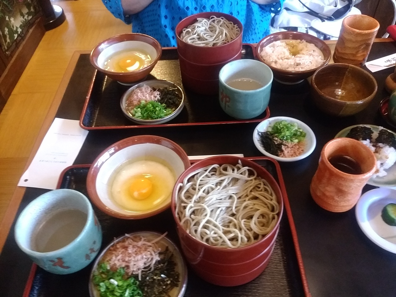 4時間かかり10時半に着いて県庁駐車場に車を停めて1番近い「ふなつ」と言う蕎麦屋に行きましたが、盆休みだったので「神代そば」に行きました。車で行ったのですが8台しかない駐車場が満車だったので、少し待ちましたが車の通行が多く県庁駐車場に停めて歩いていきました。着いたのは時間は11時40分でしたが、最初に行った時は行列はなかったのに、30人程まって入店すると店内でも並んでいたので、蕎麦をたべたのは13時20分。名物の「とろろ割子そば」と「そばみそおにぎり」「玉子かけごはん」を注文。出雲蕎麦はよく噛んで腰の強さ、豊かな香りを楽しむそうで、山葵は使わないそうです。少し細めの国産の、松江市産玄丹そば在来種十二健穀米だそうです。松江に蕎麦は何十回と食べにきましたが、待った甲斐があり美味しかったです。また、食べ方説明やお茶のサービスも良かったです。