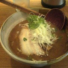 サバ節、かつお節等にとんこつ・醤油が加わった非常に濃厚な異色のスープに、中太ストレート麺、大きなメンマにチャーシューが入っています。