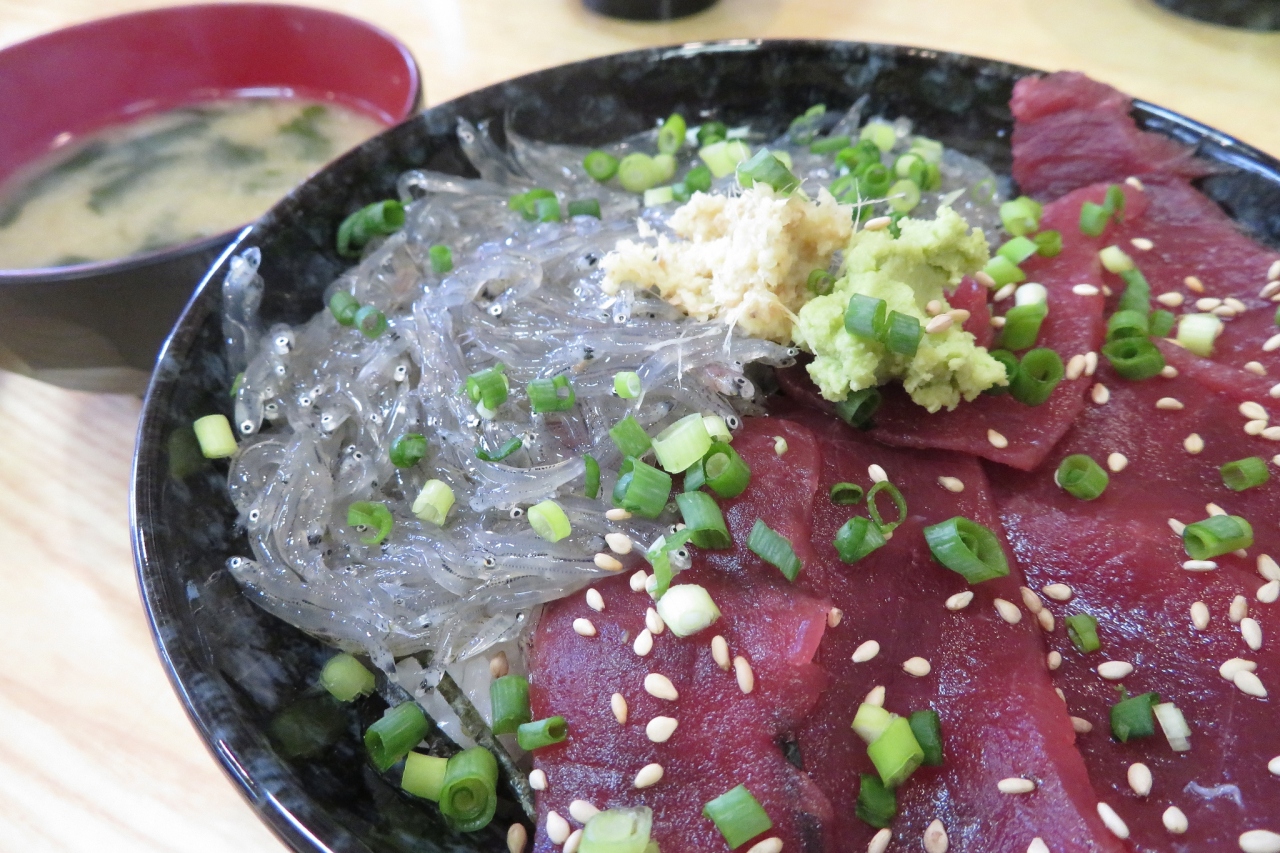 三崎といえばマグロですが、生しらす入荷の文字に惹かれて、いいとこどりの生しらす・まぐろ丼を注文。妻は生しらす・釜揚げしらす丼を注文。