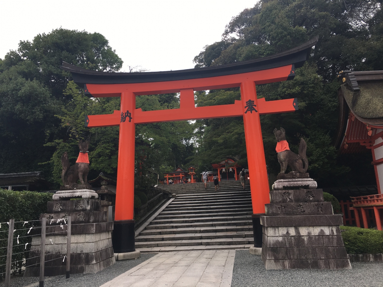 境内の至る所にたくさんのキツネがいます。キツネは神様のお使いとされているそうです。キツネの口をよく見ると様々な物をくわえているのが分かります。くわえている物によって意味合いが異なるらしく興味深かったです。