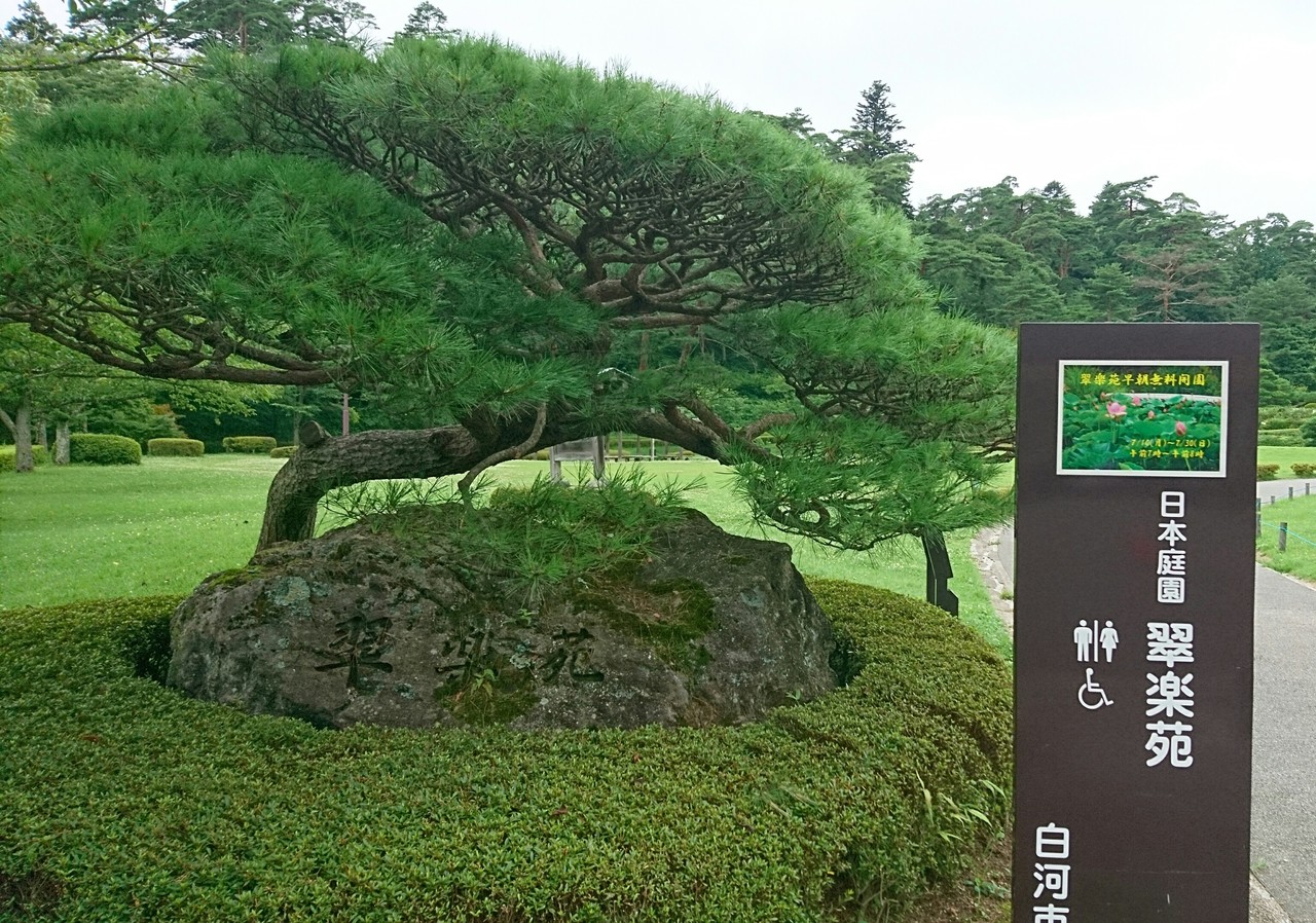 白河藩主松平定信公により築庭された日本で最古の公園と言われる南湖公園の隣にあるのが翠楽園で、とても立派な回遊式の日本庭園で、カエデの数がものすごかったので、紅葉の時期はすごいキレイなんでしょう。庭園の庭の池に大きな岩などの配置がなくてペタンとしている姿は新鮮なイメージです。