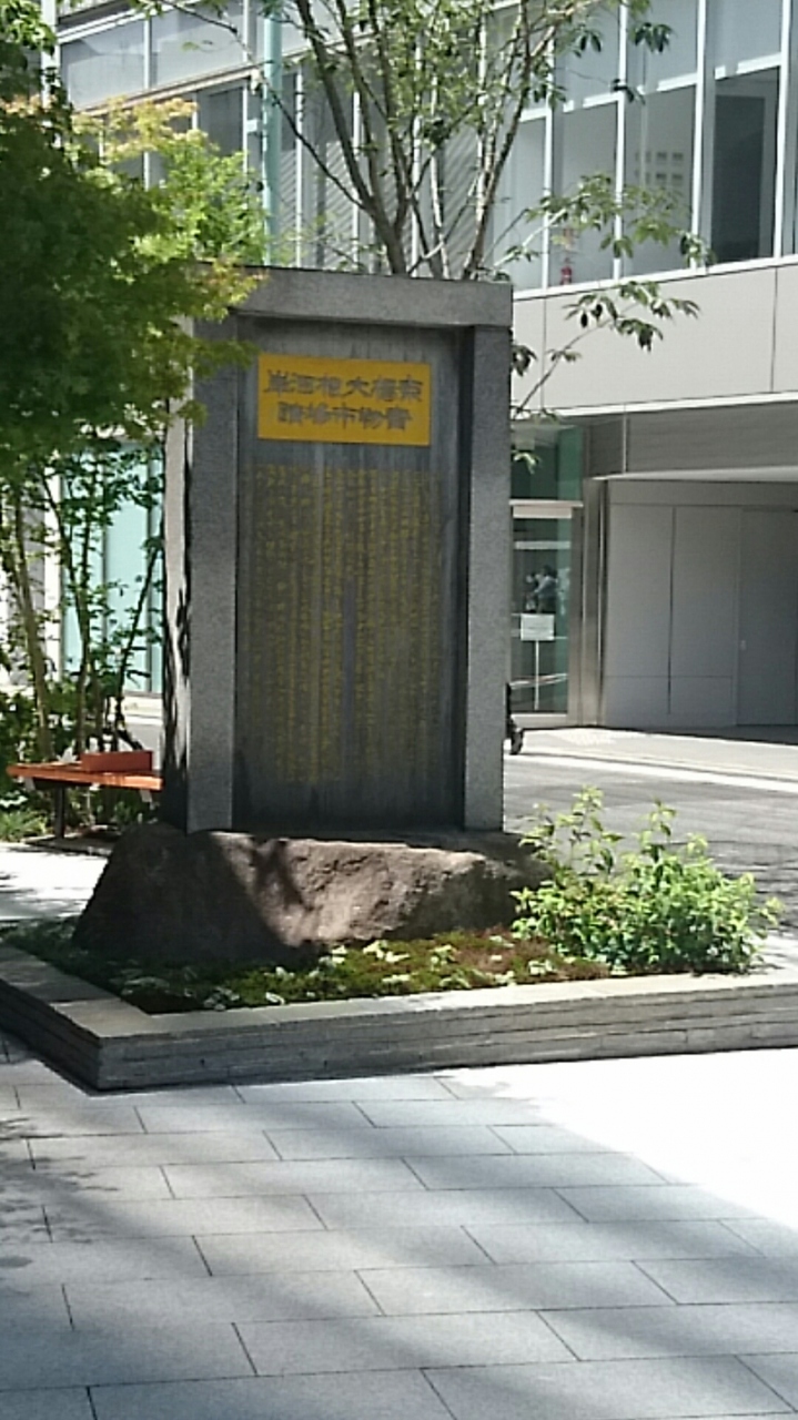 首都高速の下、京橋の親柱のたもとにあり、黄色い色がとても目立つ石碑です。昔は、町の中心部に市場があったということに驚きです。京橋川があった頃には、この地は庶民の台所を支える青物市場として栄えていたらしいですが、現在では青果市場は築地へと移転されています。冬に運ばれてきた大根が、花が咲いたように見えたことから大根河岸と名づけられたということです。
