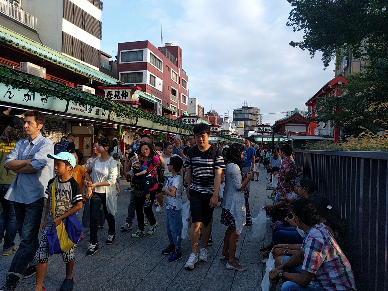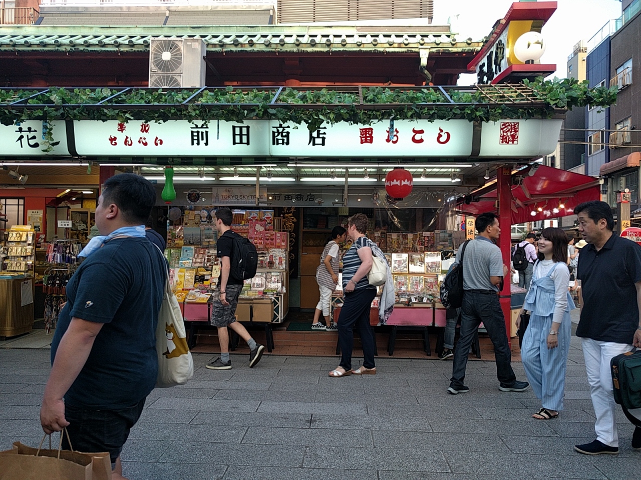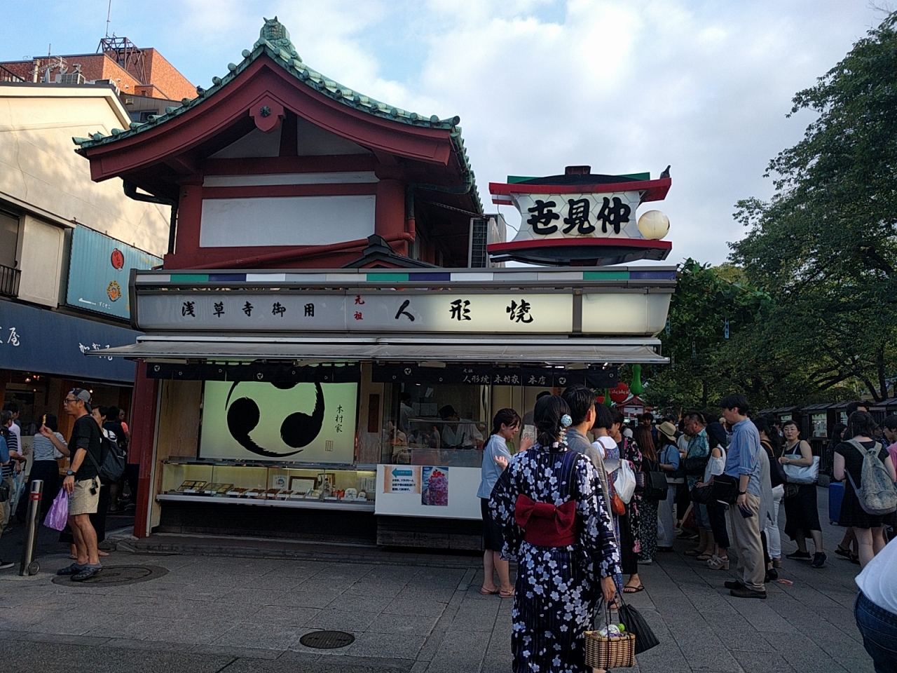 浅草寺から雷門に続く、300m足らずの間に、土産物屋や飲食店が軒を連ねてます。浅草の名店も数多く、揚げまんじゅうや人形焼、きびだんごにメンチカツ等いろいろ食べ歩きが楽しめます。ユカタをレンタルして着てる人もいるので、ぶつからないように気をつけましょう。