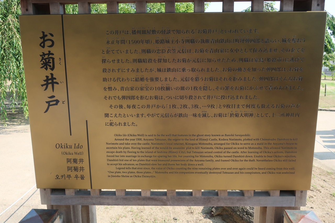 姫路城の天守を見学した後、備前丸から出口に向かって下りりの門を通った上山里の中程に石の杭で囲まれたお菊井戸があります。お菊さんと言えば番町皿屋敷なので、何でこの場所に?江戸じゃないの?と思ったら、実の舞台は番町ではなく、播州だったんですね。