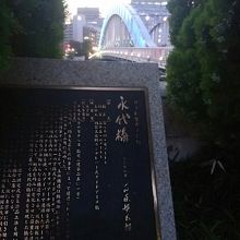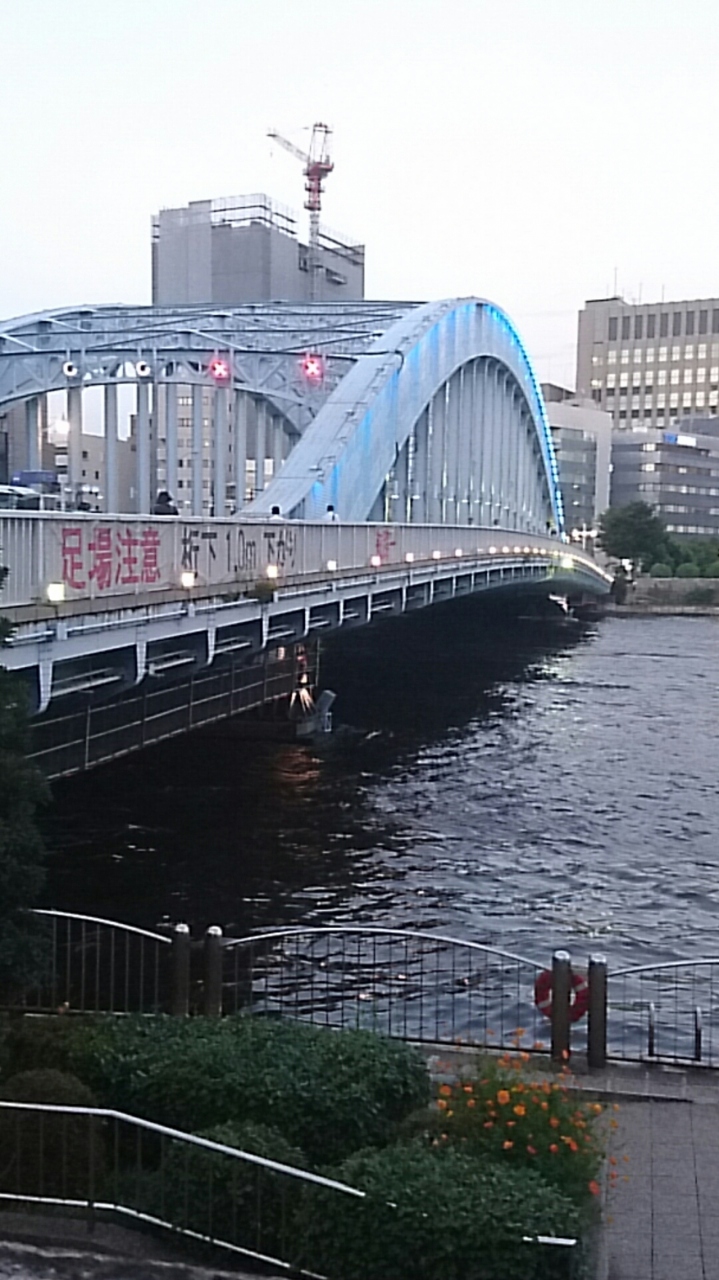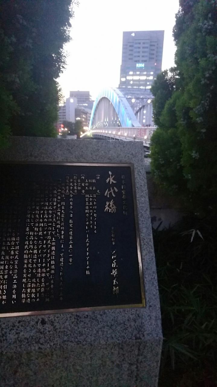 日本橋方面から霊岸島に向かって永代通りを進んでいくと、アーチがかかった大きな橋が見えてきます。それが永代橋です。地図で見る以上に立派な橋が前方をふさぐように見えるので、とても迫力があります。橋の上からは夕日が沈んでいく景気がきれいに見えるので、多くの人が撮影をしています。