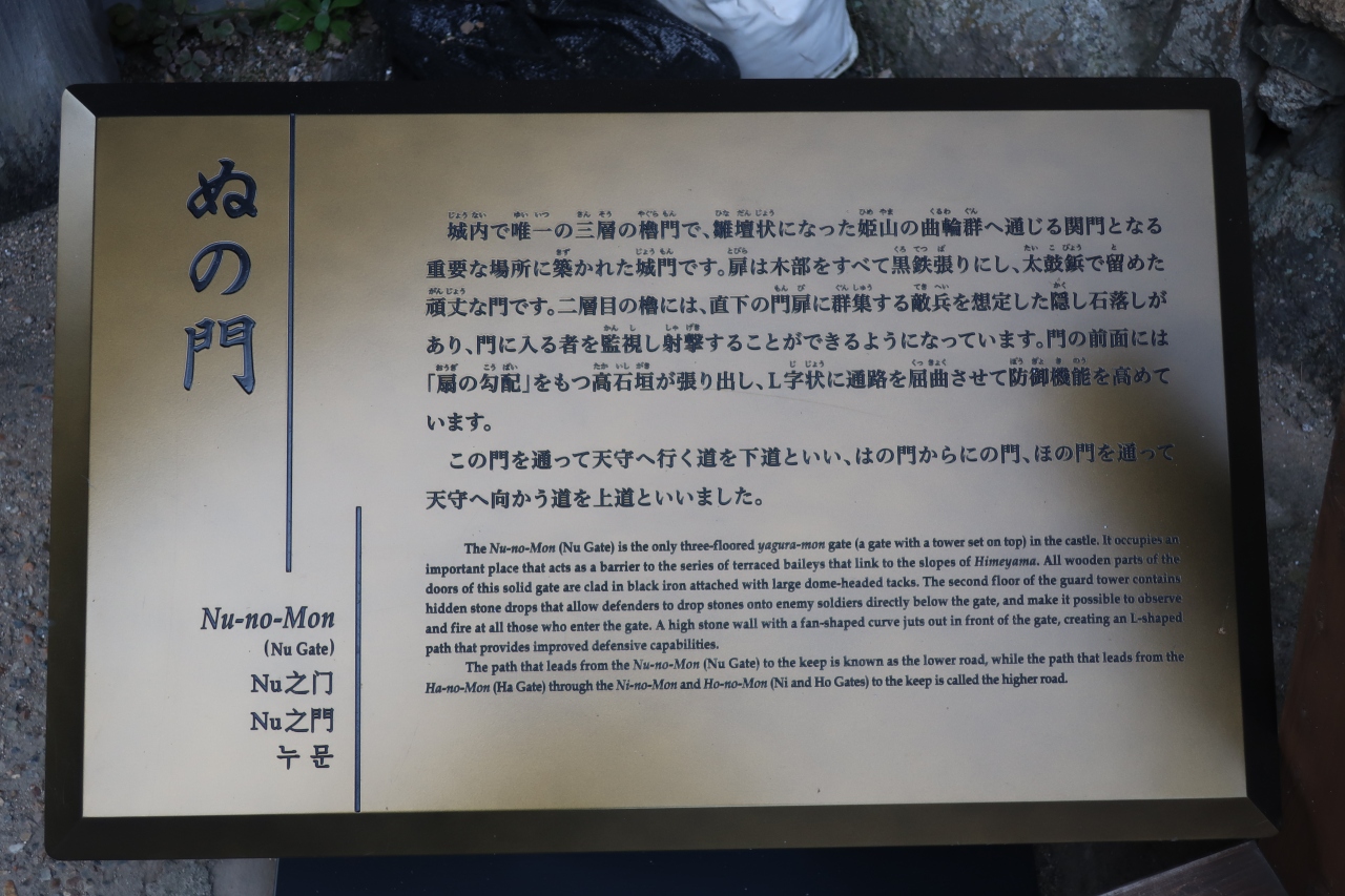 姫路城見学コースの最後の方、扇の勾配に出る手前に姫路城 ぬの門があります。櫓門は色んなお城に残っていますが、この門は何と三層造りの櫓門。現在残っている櫓門では唯一この門だけだそうです。知らないと単に通り過ぎてしまいますが、とても貴重な櫓門です。