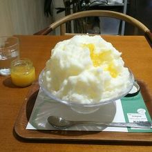 氷にはジンジャーミルクがかかっており、オレンジのコンフィチュールが別添えで提供されます。