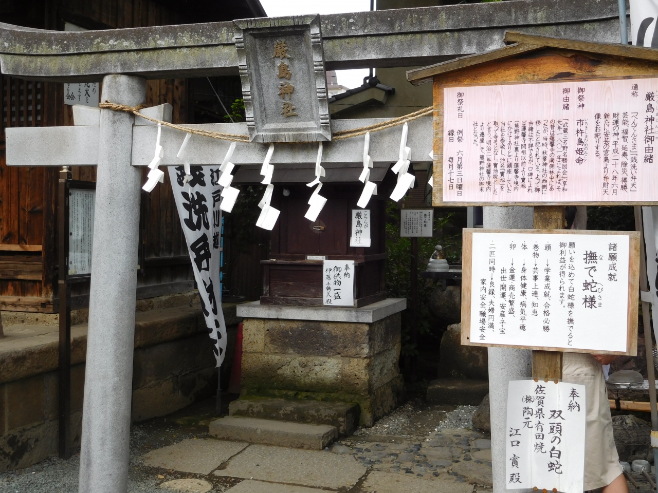 開運や縁結びの神様が祀られている「川越熊野神社」本殿のすぐ手前側にあります。小さな神社ですが、とても熱心にお参りをされている人がいて、どんな御利益のある神社なのだろう、と確認すると、銭洗弁財天を祀る厳島神社だったので、なるほど、と思わず納得してしまいました。神社の奥には「撫で蛇様」も祀られ、傍には、銭洗い場もありました。岩場には、弁財天様もいて、神聖な感じがしました。