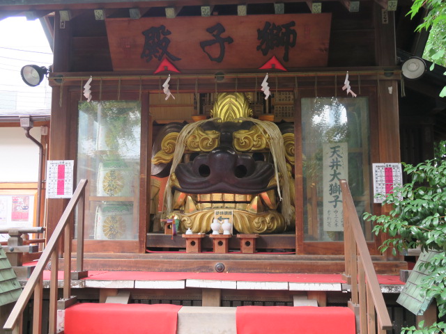 神社境内に入ると獅子殿には天井大獅子、対面にはお歯黒獅子が祀ってある。