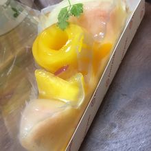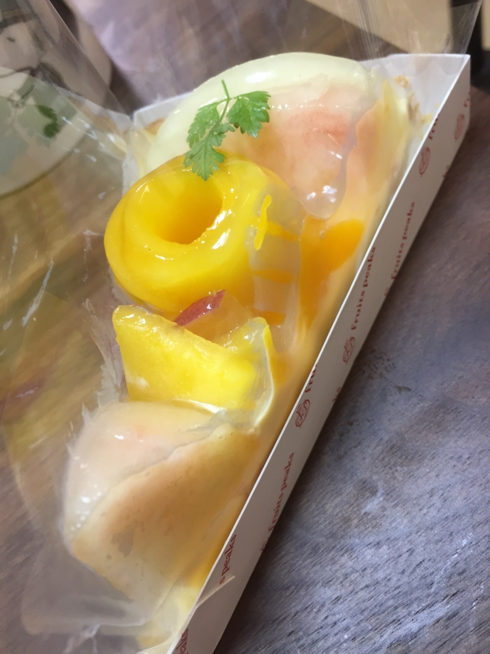 どれもフルーツたっぷりで美味しそうで選ぶのに苦労しましたが、季節感のあるマンゴーと桃のタルトにしました。
