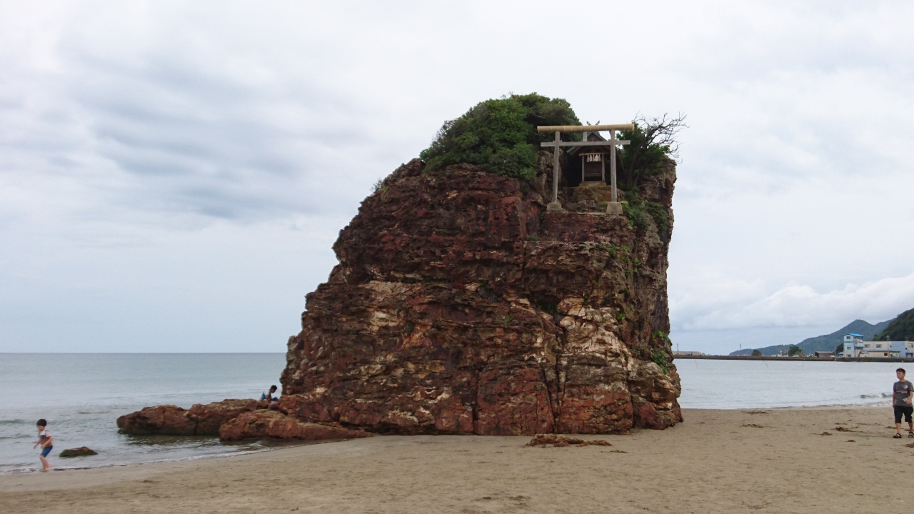 出雲大社に参拝する前に稲佐の浜に行きました。稲佐の浜は年に一度、全国の八百万の神々をお迎えする浜でもあるため、参拝上級者は稲佐の浜で拝んで、神迎の道を歩いて出雲大社に参拝するため、自分も稲佐の浜から行きました。稲佐の浜にある弁天島はよく見ると岩の表面が波で削られていて表面がデコボコしてました。
