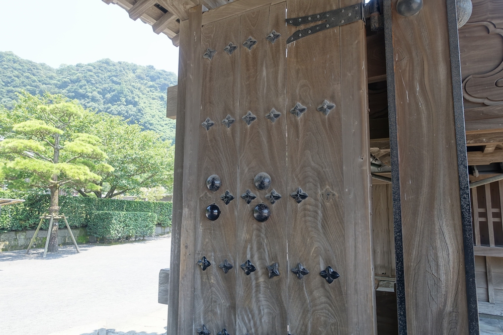 海に向かって建っているこの正門は、明治になってから敷地を拡張した際に新たに造られた門です。現在は外との出入りはできませんが、門を海側と園側両方からじっくり見ることができます。