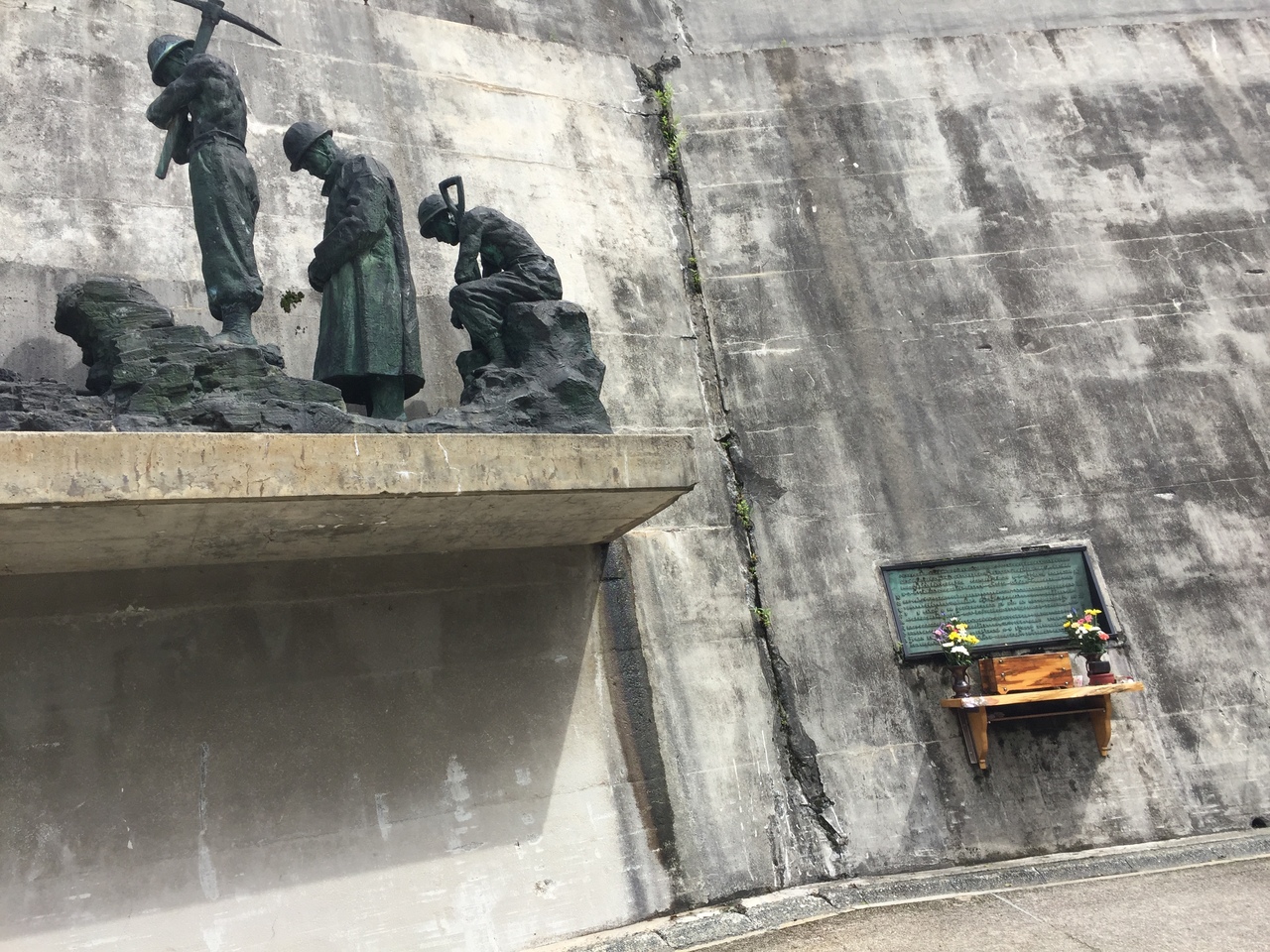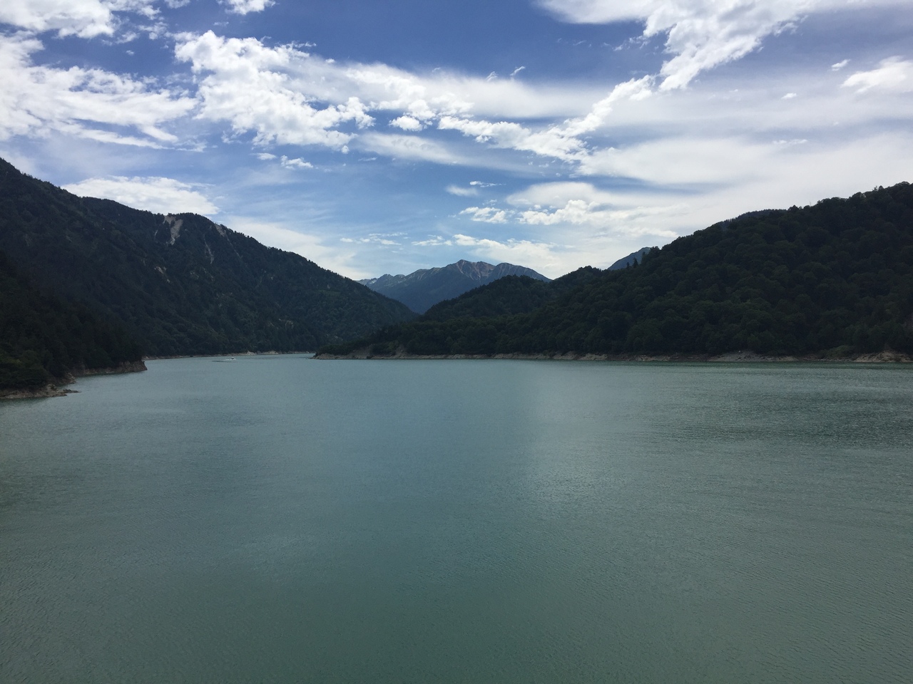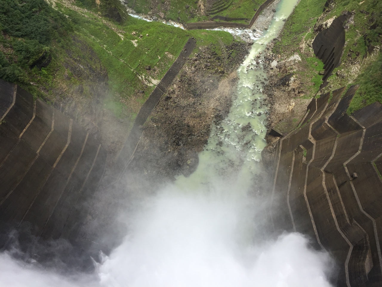 ダムのエメラルドグリーン 山々の緑 青い空 そしてものすごい量の放水。