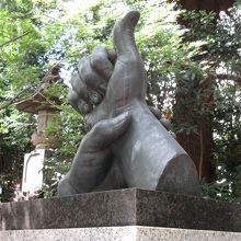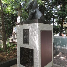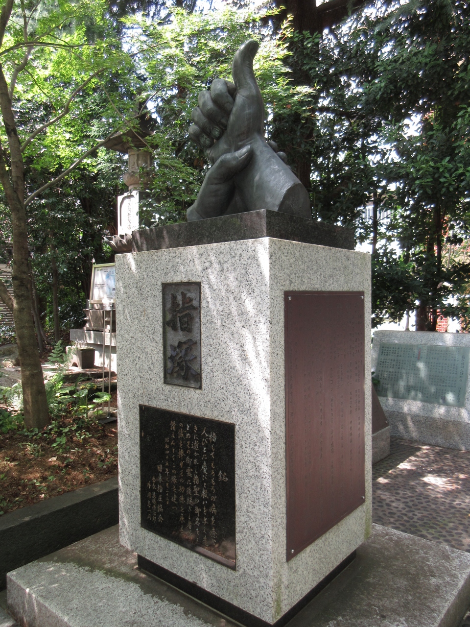 伝通院の入口に建つ総檜造りの山門を入って左手に立っています。指圧界で功績を残した方たちを祈念して立てられました。1mほどの土台の上に親指を立てた手首がのっている立派な塚です。山門手前には日本指圧専門学校が建っています。墓地内にはテレビで名を馳せた指圧師・浪越徳治郎さんの墓もあります。そんな関係で伝通院内に塚が立っているのだと思いました。