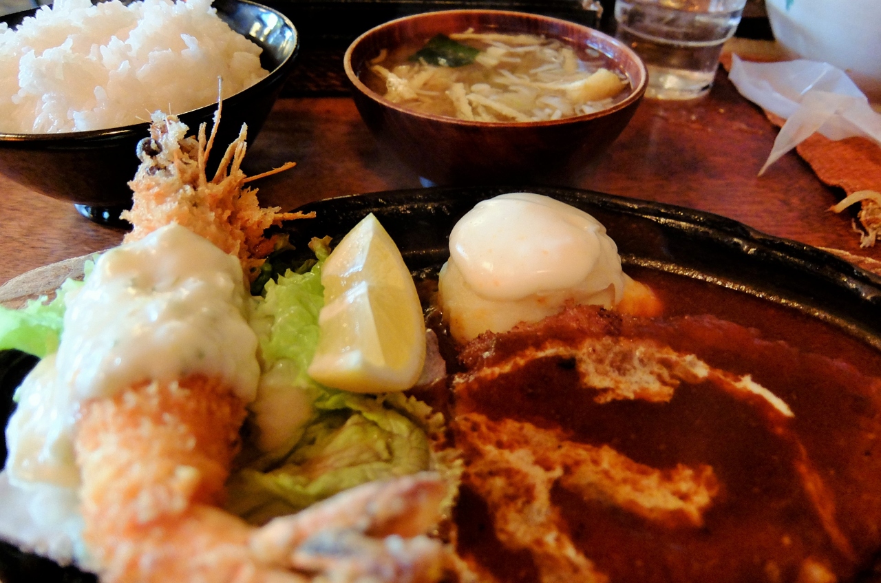 私はハンバーグとエビフライの定食を注文しました。