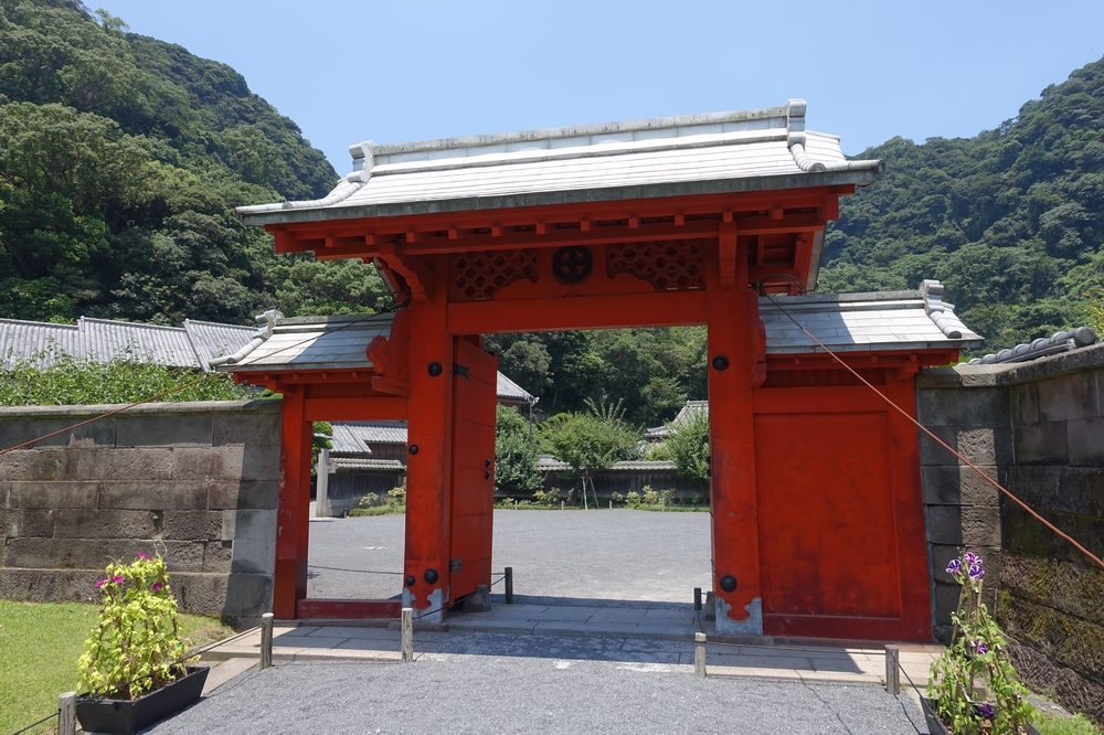御殿の前にある朱塗りの門。現在の正門は明治になってからできたもので、江戸時代まではこちらが正門。当時は藩主とお世継ぎだけしかこの門を通ることができなかったそうで、時代の違いを感じてしまいます。旧・正門という割には小さな門ですけど、さぞかし特別な門だったのでしょう。