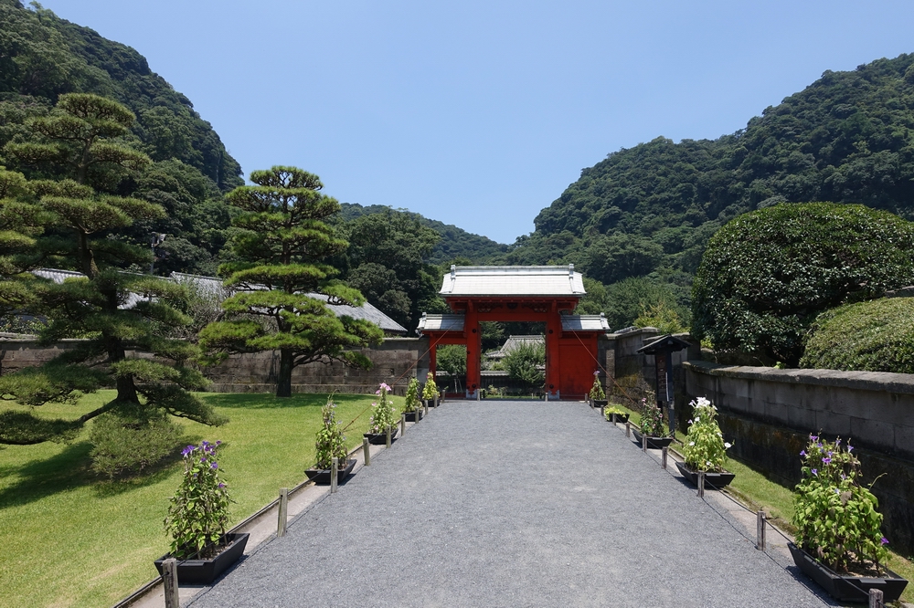 この門の最大の特長は、錫門という名前の由来にもなっているとおり、屋根が一般的な瓦ではなく錫で葺いてあることです。白っぽくも見えるし、太陽光が反射して銀色っぽくも見え、朱色とのコントラストも美しいです。ぜひ屋根にも注目してください。