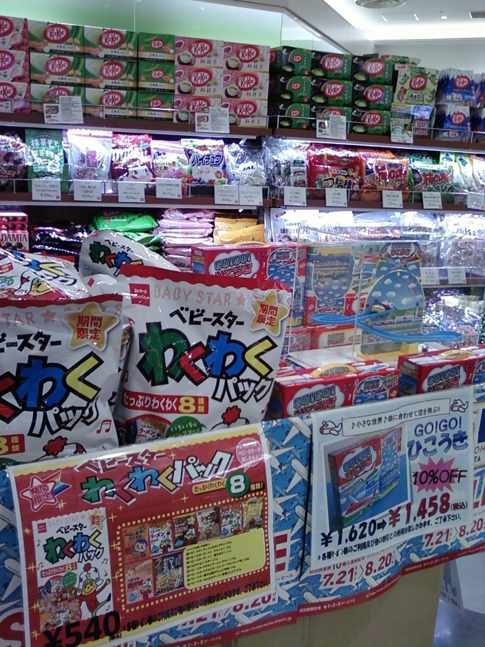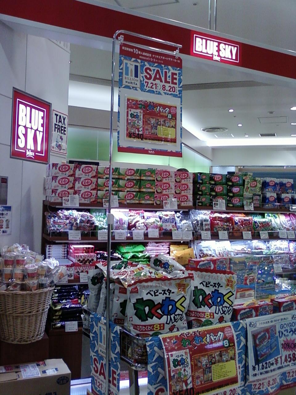 ここのブルースカイ、おみやげプラザは、成田国際空港、第二ターミナル本館の4階にあります。JAL系列のおみやげ屋さんで、成田、羽田空港はもちろんのこと、日本各地の空港でよく見かけます。ここは中でも結構広くて、おみやげプラザらしく、驚くのは、スーパーなどでよく見かけるスナック菓子が大量にあること。とんがりぼうやキットカットの大きなパッケージなど。これらのシリーズが外国人旅行者、それから海外に住んでいる日本人にも多く需要があるのかもしれませんね。