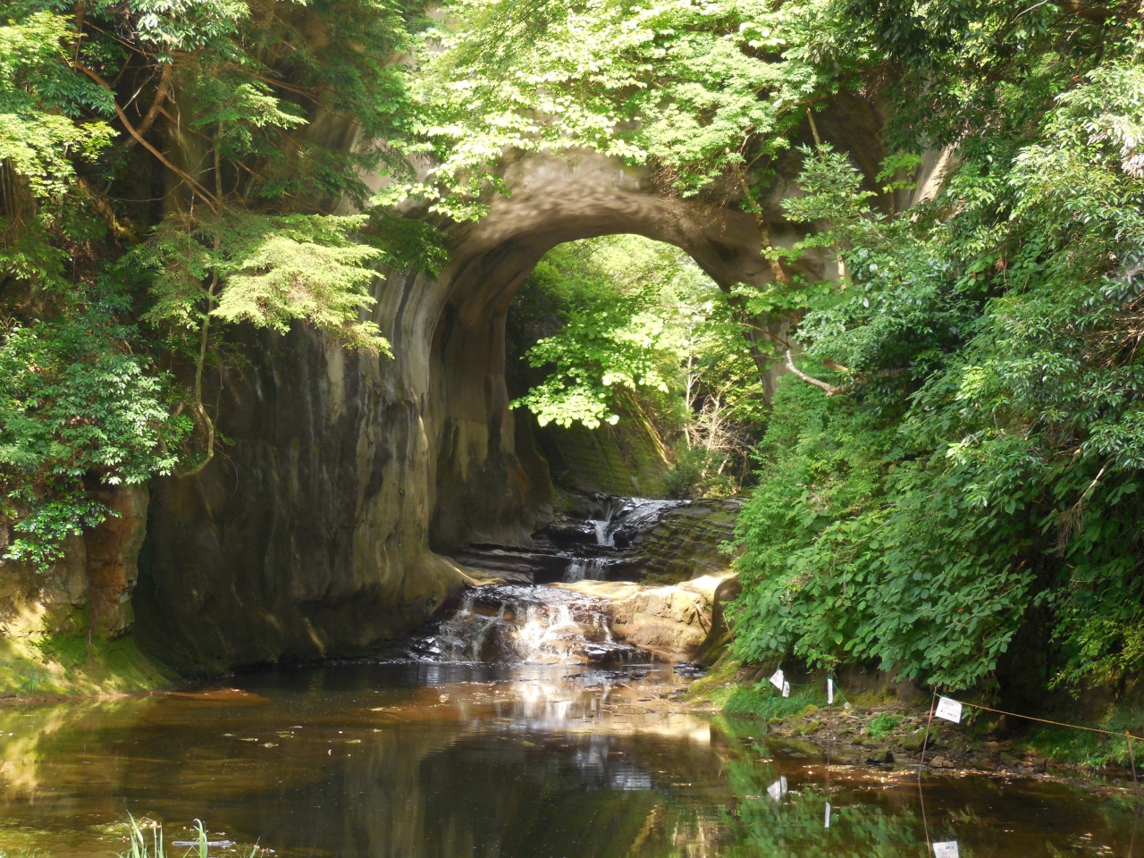 ここ数年急に脚光を浴びることとなった人工トンネルを指しているようです。元々は江戸時代に水田に水を引くために岩に穴を掘り引水したもので、この穴の正式名称は亀岩の洞窟です。確かに岩に穴が開いていますという感じ。本当の滝は50メートルほど下流にありますが、訪れた日には水量が少なかったためか、なだらかな流れで滝という感じではないです。