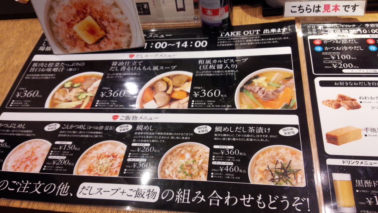 日本橋だし場では、かつお節だし(冷/温)、月替りのだしスープメニュー、かつぶしめし、数量限定のお弁当、惣菜と幅広くメニューをイートインで食べることができます。