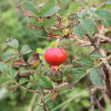 立ち枯れたトドマツとピンクの花、赤い実のハマナスが対照的で印象的でした。