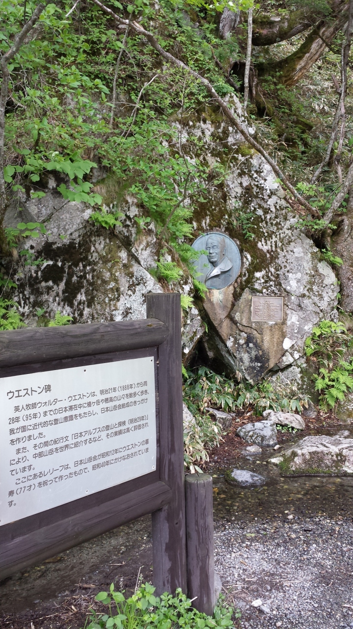 大正池から河童橋に向かう際に立ち寄りました。コース上にこのレリーフがあることはわかっていたのですが、実際に行ってみるとひっそりとして何とも地味な印象でした。見落としてしまいそうな程、周囲の岩肌と馴染んでいました。