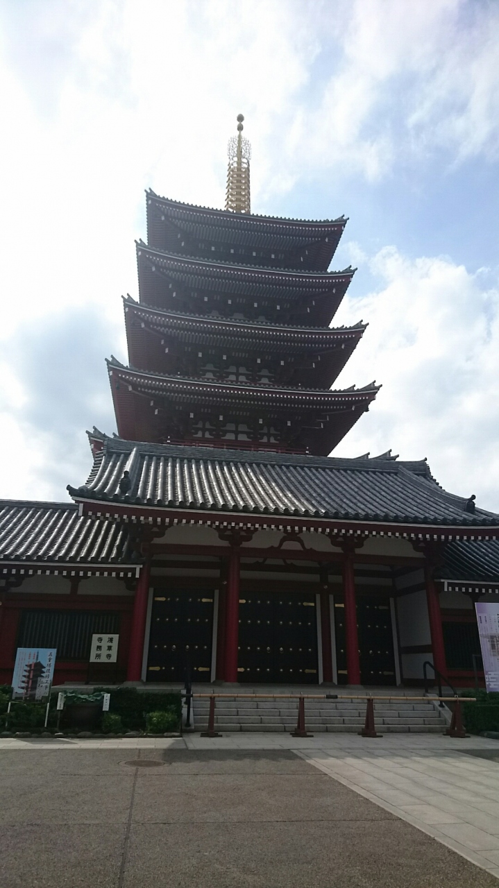 浅草寺に入って左手に進むと立派な五重塔がありました。昭和48年に再建されたものですが、とても鮮やかな朱色の五重塔でした。昔は本堂に向かって二つの塔が左右に配置されていたらしく、その礎石が現在も残されています。広い境内の中で五重塔が浅草のランドマークになっています。