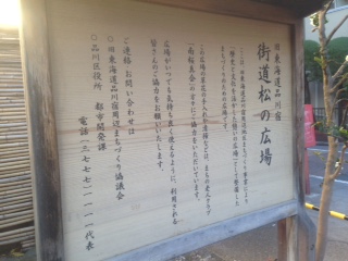 旧東海道品川宿散策の際に、通り沿いにこの広場がありました。確かに松の木が植えてあり、そう言われると、なんだか趣がある様にも見えます。近所の方の休憩所、喫煙所?らしく、おじさんたちがベンチに座り込んで、タバコをふかしていました。あまり良い光景には見えませんでした。せっかくの観光地が台無しです。