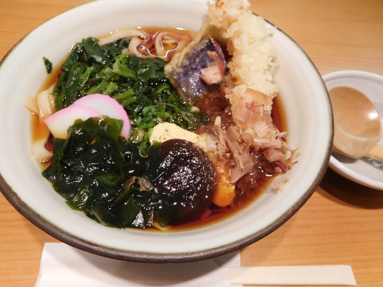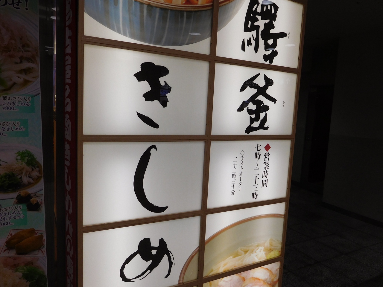 名古屋駅のコンコース内(名古屋中央通り)にある、きしめんのお店です。名古屋駅に着いたのが22時近くで、ほとんどのお店がオーダーストップか閉店時間になってしまって、困っていた所、23時まで営業(ラストオーダーは22時半)していたので、すごく助かりました。セットメニューの「天むす」は品切れとなっていましたが、きしめんは問題なく注文出来ました。メニューによっては、しょうゆ味の他に、塩味やみそ味もあり、珍しいなと思いました。店名と同じ「驛釜きしめん」を注文しましたが、いろいろと入っていて、美味しかったです。