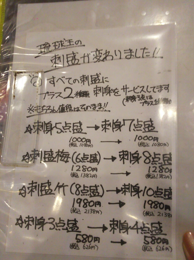 メニューは沖縄料理のほか、刺身や串焼きなど色々あり、どれもリーズナブル。ものすごく美味しいかと聞かれるとノーですが、「まぁ、こんなもんかな」という感じで楽しめるお店だと思います。
