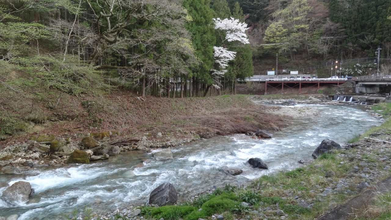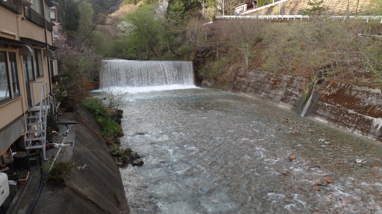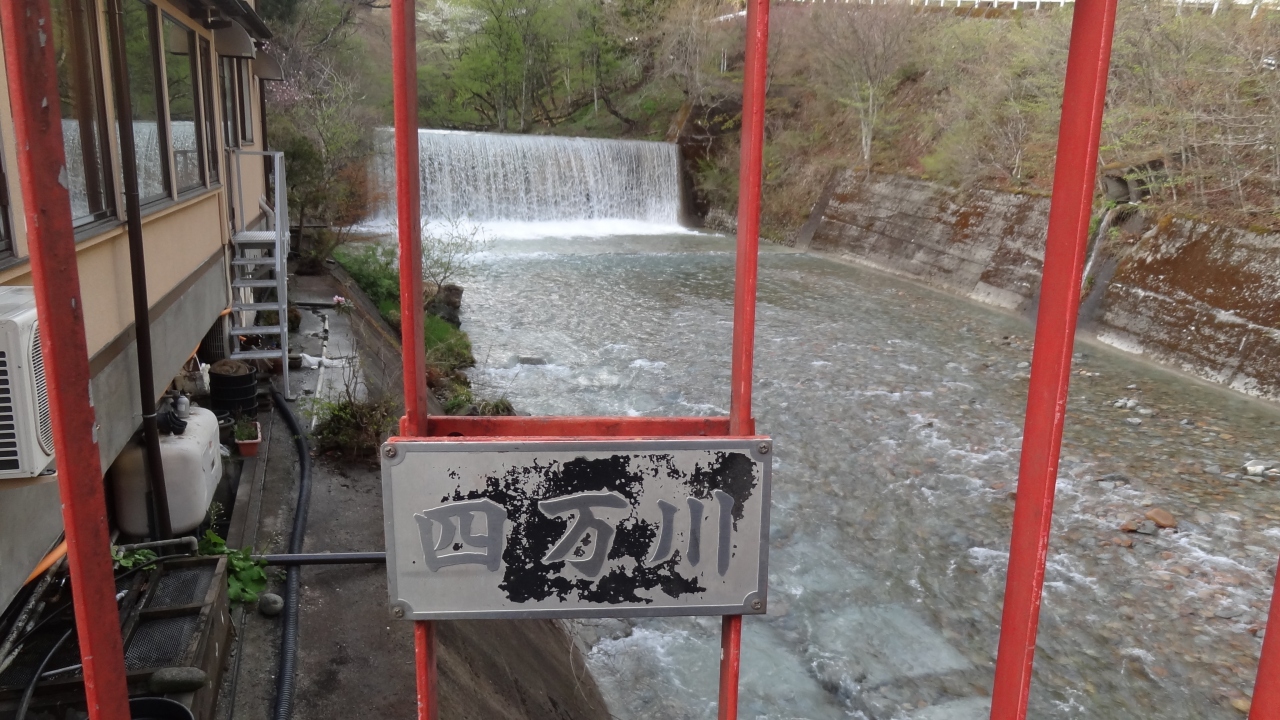 四万川は、群馬県の四万温泉を流れる川です。川沿いには公衆風呂や温泉旅館、お土産屋さんなどが並びます。温泉街以外は深い緑の中を流れ、季節によってはその美しい木々とのコントラストも見所です。ちょうど桜の時期に行けたので、川沿いの美しい山桜も見ることができました。