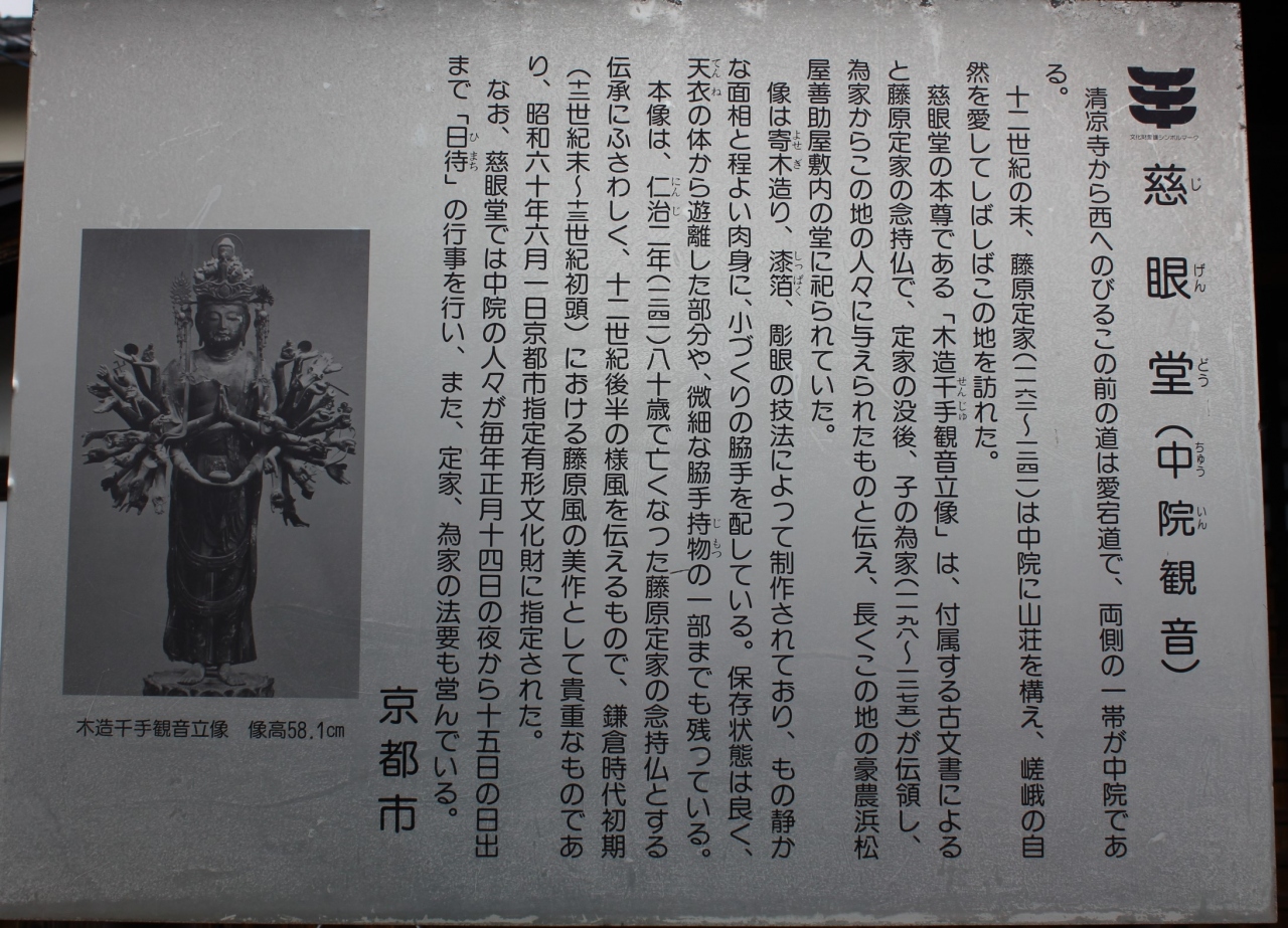 説明によると、「本尊の木造千手観音立像は、鎌倉時代初期に制作された藤原定家の念持仏で、子の為家がこの地に与えた」とありました。