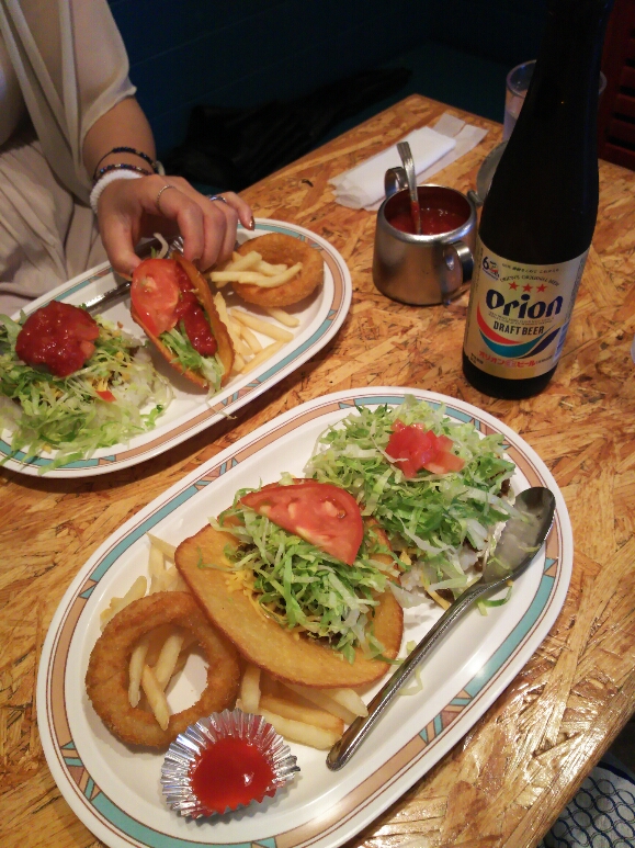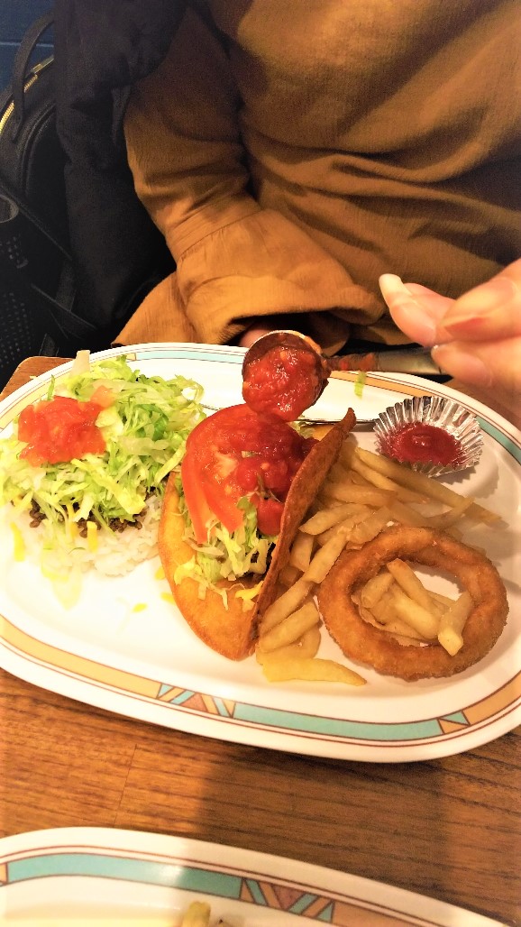 タコスはパリパリ&しっとりの絶妙なバランスが本当に美味しいです。オニオンリングも食べごたえがあります。
