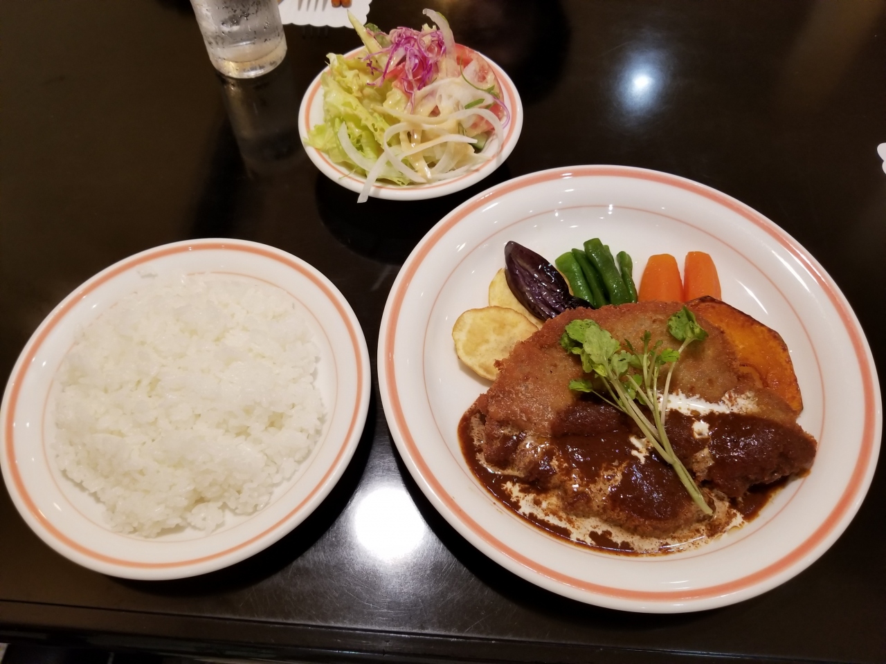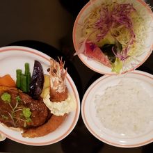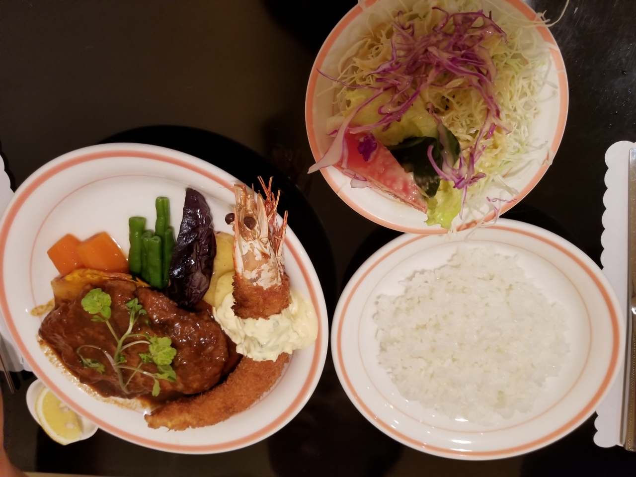 そして量が大きい。この値段であれば100~120g位を想定するのですが、150gはゆうにあったと思います。海老フライも大きく、ボリューム満点です。