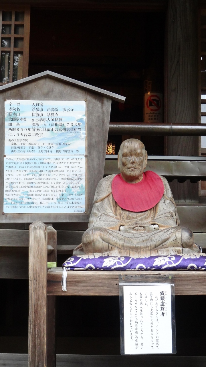 深大寺の元三大師堂は、慈恵大師(元三大師)像を安置しているお御堂です。江戸時代の火災においては、本堂よりも先に復興されたということで、とても当時の人々から信奉が厚かったようです。この元三大師像は秘仏となっていて、平時に拝観することはできないとのこと。代わりに大師堂の縁側に安置される、木彫りの賓頭廬尊者に目が行きました。多くの救うということっで、悪いところをなでると良いとのこと、あちこちなでられていました。