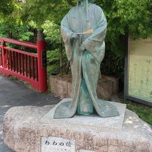 有馬温泉にあるねねの橋のたもと近くにたつ太閤秀吉の正室ねねの立像です。屏風の前に石の上に乗ったねね像は、扇子を持ち、少し右を向いた姿で立ち、見つめるその先にはゆけむり広場に正座する太閤秀吉の像が。仲睦まじく見つめ合う姿に気づくでしょうか?