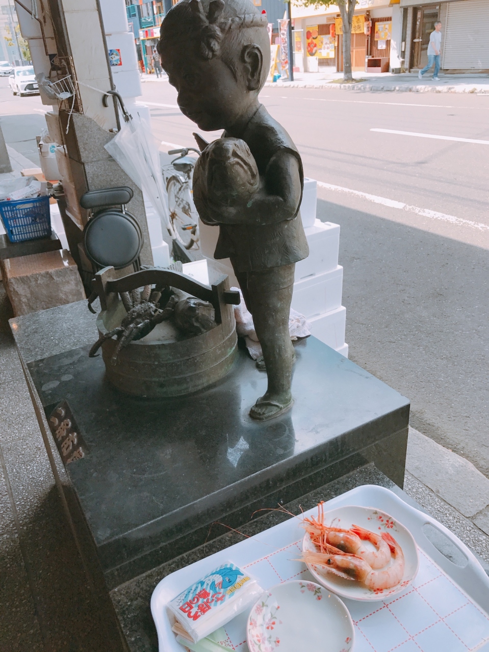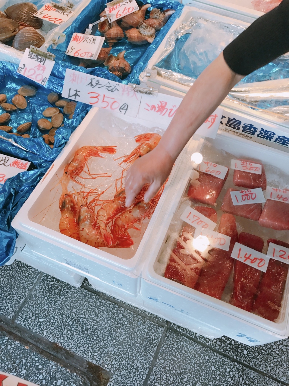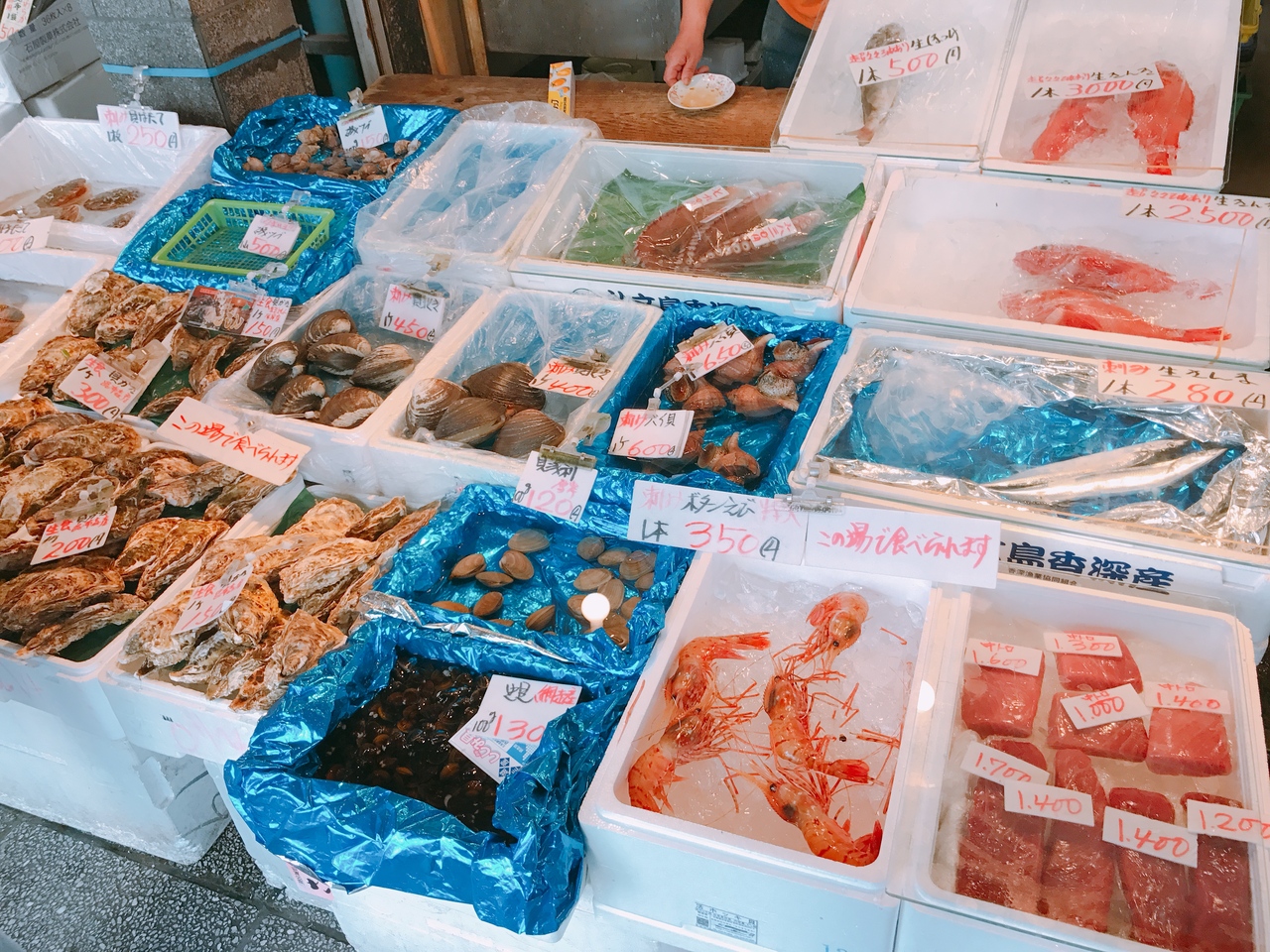 お天気が良かったです。市場には屋根が出ていて雨の日でも濡れないと思います。活きの良さそうなそして大きなサイズに惹かれてボタン海老を買いその場で食べました。店の人が殻をむいてくれて醤油やわさびティッシュペーパーが用意されていました。ボタン海老は身が大きく味噌もしっかりいただきました。他の店では値段も違うそうなので比べてみるのも楽しいと思います。次回は店頭に並んでいたカキも食べたいです。