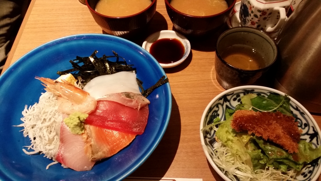 出光美術館で仏教美術「祈りのかたち」を鑑賞した後、同じビル内にあるここを訪問しました。エレベーターで1階に降り、乗り換えて地下1階へ。12時前に行ったので、先着10名限定の品も頼めましたが、980円でちらし寿司とアジフライとみそ汁が付いている物を頼みました。美味しかったです。12時過ぎるとサラリーマンで混み、入口で待っている方もいました。