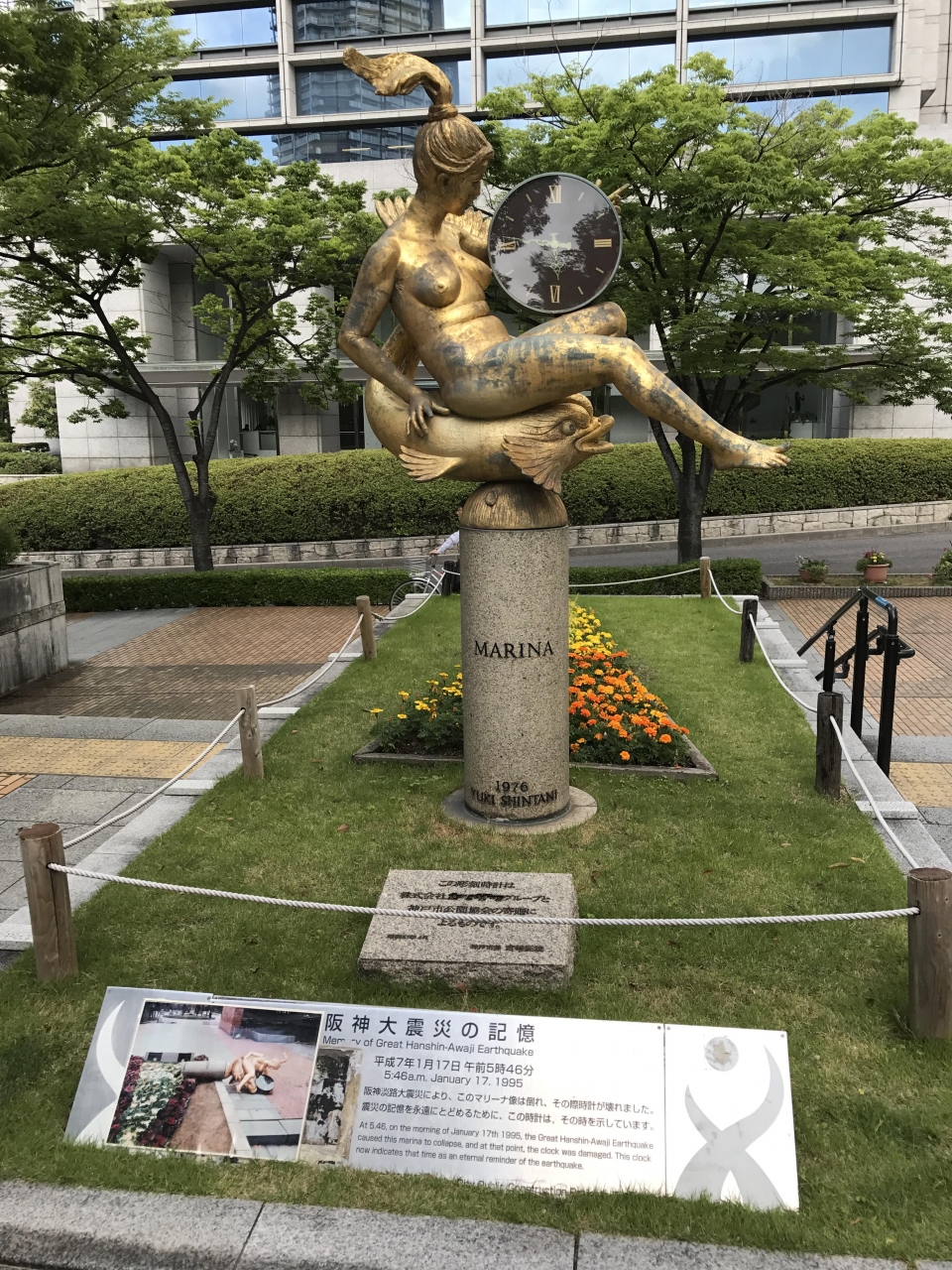 神戸の東遊園地にある、時計を抱いた女性の銅像です。この銅像は阪神・淡路大震災で倒壊したそうですが、その後修復されて今に至りました。時計の時刻は、5時46分と地震が起きた時のままになっていました。今では震災の記憶モニュメントとしてこの場所にあるようです。