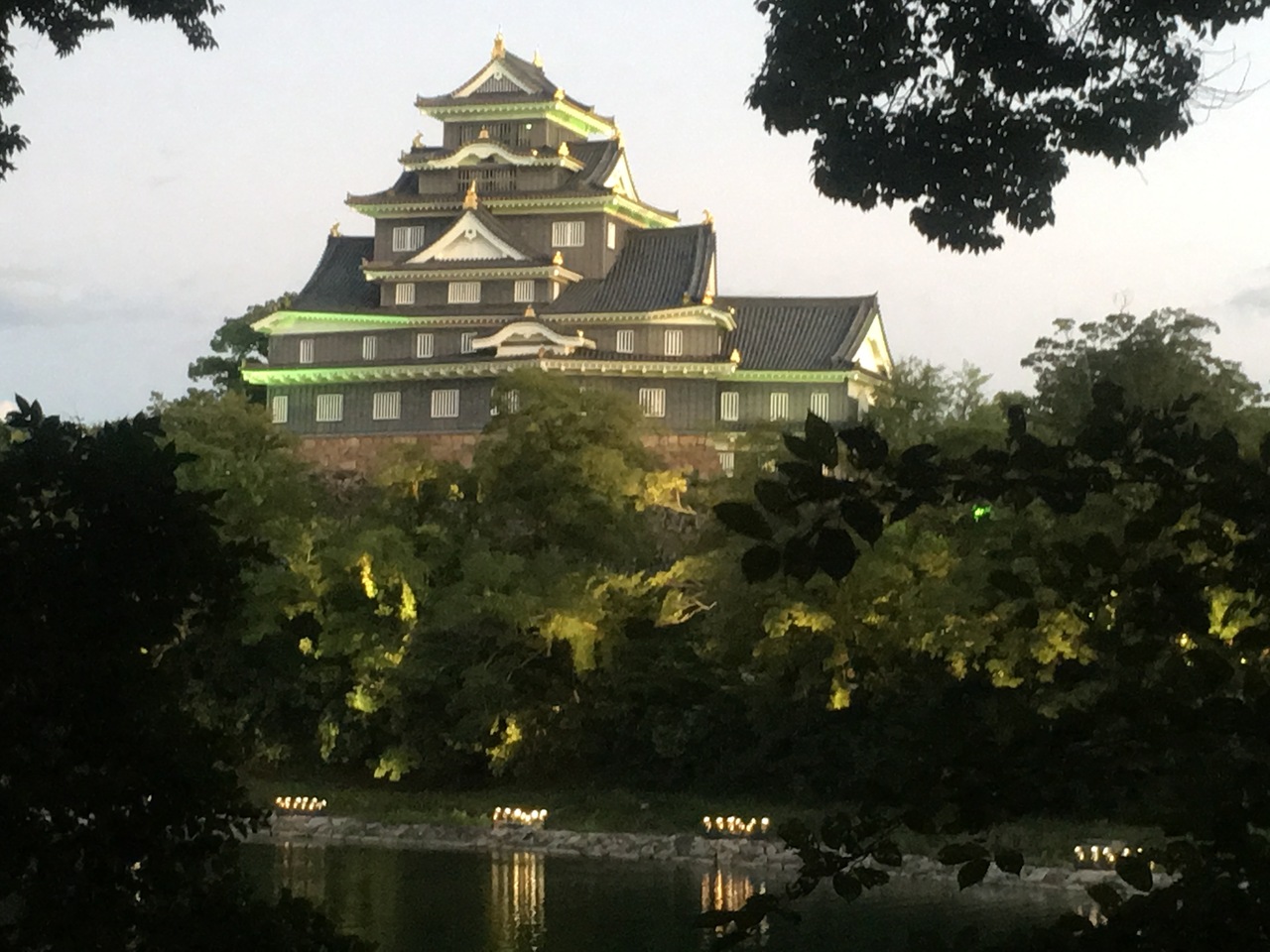 黒い壁と金のシャチホコが特徴のお城。夏のライトアップの最終日なので、飛行機の最終便に乗らずに夜行バスで帰ることにして、ライトアップを楽しみにしたが、この日は好天に恵まれすぎて、18時半頃日が沈んでもまだ明るかった。