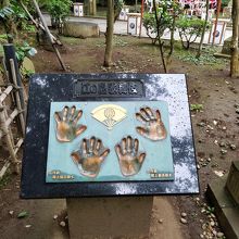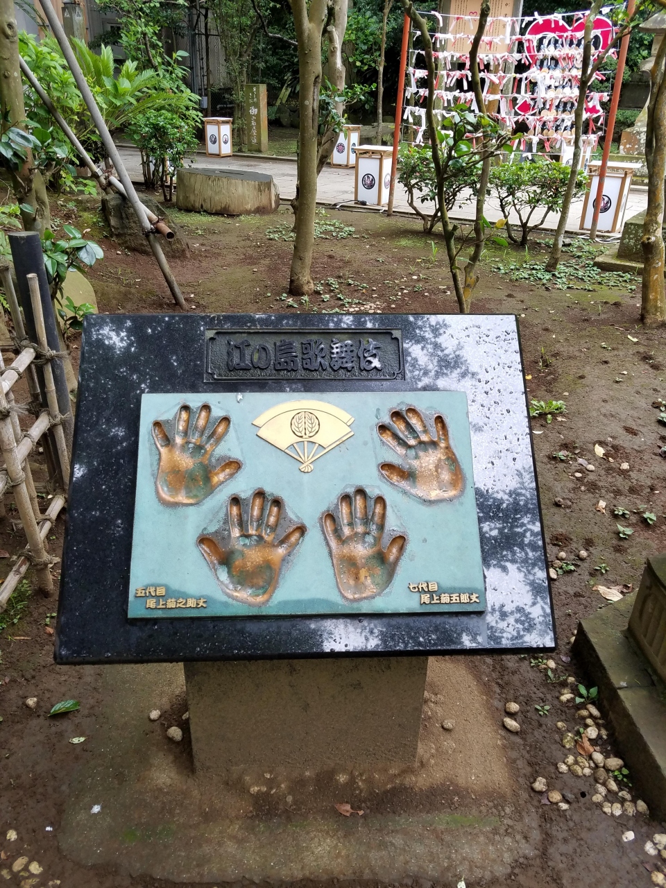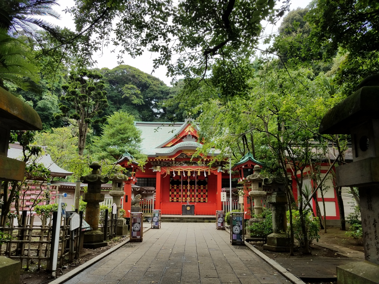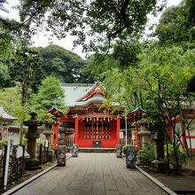 辺津宮から看板にしたがって参道を登ったところにあるお宮です。辺津宮の落ち着いた造りとは違い、鮮やかな朱色の社殿がとても印象的です。社殿に続く参道脇には、江の島での歌舞伎開催を記念して造られたという「江の島歌舞伎」の手形のオブジェがあり、目を惹きます。また、参道の石段からは、眼下に相模湾が一望でき、なかなか素晴らしい景色でした。