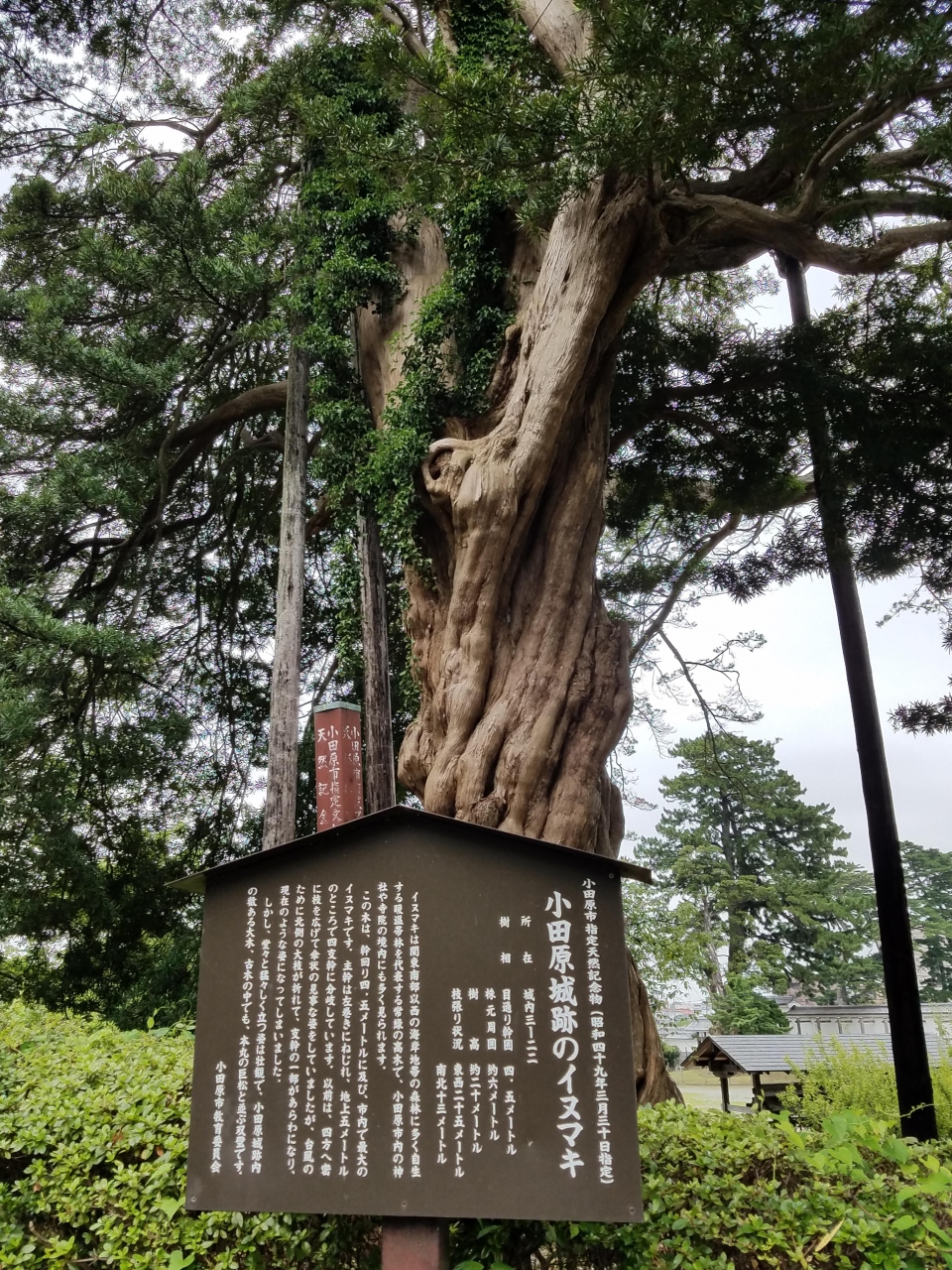 「イヌマキの木」は、小田原城址公園内の「歴史見聞館」から常盤木門に続く道沿いにあります。とても大きく幹回りで4.5メートルあり、ねじり上がっているのが特徴で、市の天然記念物となっており由緒ある木です。触れることはできませんが、見上げるだけでパワーが伝わってくる気がしました。