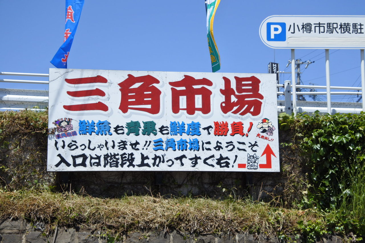 JR小樽駅を出てすぐ左側に三角市場という目立つ看板が見えます。