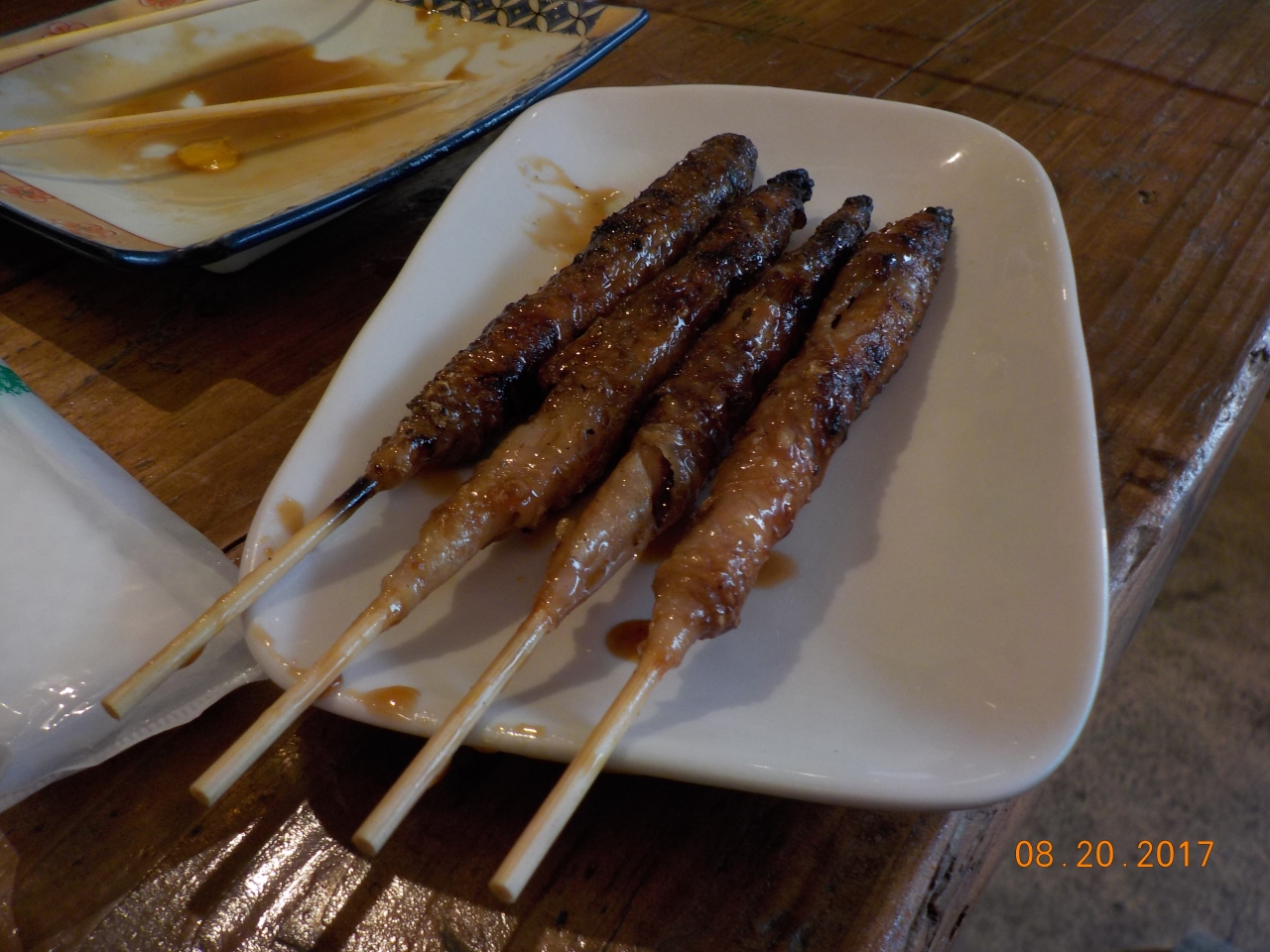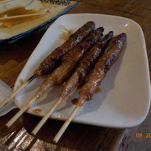 チェリー自体も小さな店内は常連客らしい人のみで、私たちは店頭のテーブル席に案内されました。串焼きのお店ということですが、ご飯ものや麺類が一切ないようです。家族連れには向いていないです。酒飲みのお店ですね。