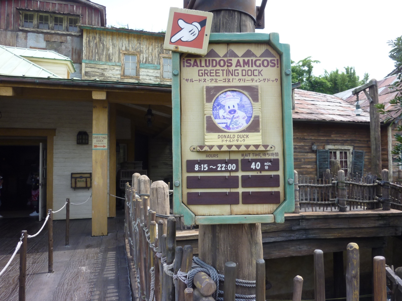 蒸気機関車の乗場の反対側にアルグリーティングスポット。ドナルドともグリーティング出来る可能性がある場所があるのを初めて知りました。ここは、設定が仲間達なので、どのキャラクターもメキシカン風の明るいファッションで飛び出てきます。グリーティングはコスチュームでも気分が変わることに気づかされました。