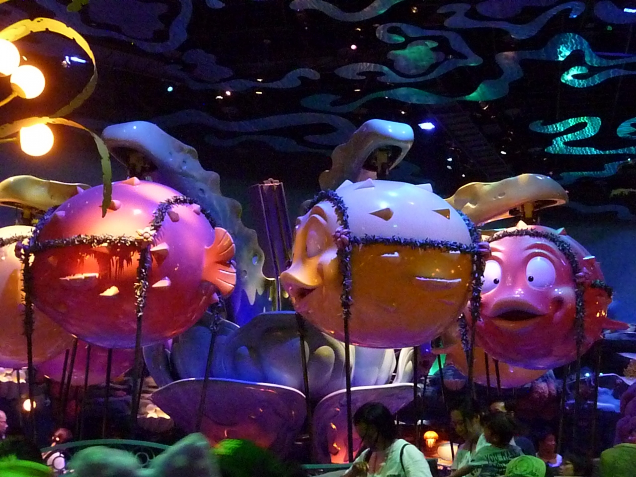 マーメイドラグーンの屋内アトラクション。ふぐの様な魚がキャリアをつり下げて、ぐるぐる回ってくれます。屋外と違って、屋内だからか、スピード感が結構あります。しっかり乗り物に捕まっていないと、外に飛ばされそうな錯覚に襲われました。