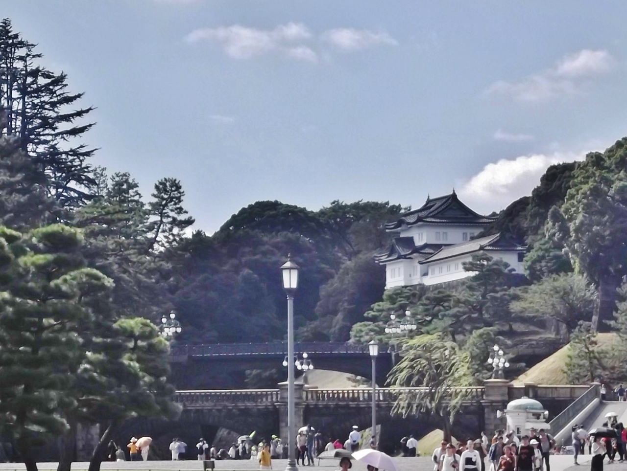 二重橋前の交差点を渡り終わった直後で視点を高くすると、辛うじて2つの橋が見える。