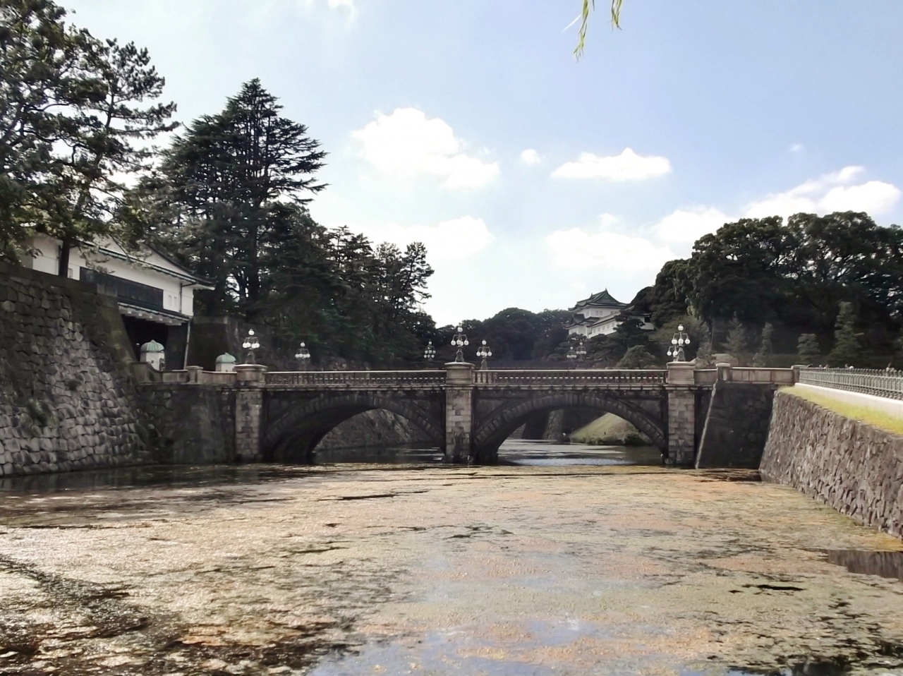 皇居前広場をまっすぐ進むと、正面に二重橋がある。この橋は手前に石橋、奥に鉄橋と2つの橋が並んで架かっているが、橋の近くまで寄ると鉄橋は石橋に隠れてしまい、2つの橋を同時に見ることができない。